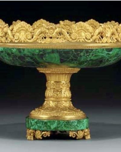On his arrival in Paris in 1801, Count Nikolai Demidoff (1773-1828) set out almost immediately to engage the services of the city's leading manufacturers of luxury decorative objects that, amongst others, included Odiot. Jean Baptiste Odiot usually worked with silver or gilded silver but was also known for his joint projects and close collaboration with other Parisian workshops that included the bronze maker, Pierre-Philippe Thomire (1751-1843). It was Demidoff who pioneered the creation of decorative objects, that became the hallmark of the Thomire workshop, that combined gilded bronze with malachite, that Demidoff would supply directly from his mines in the Urals.