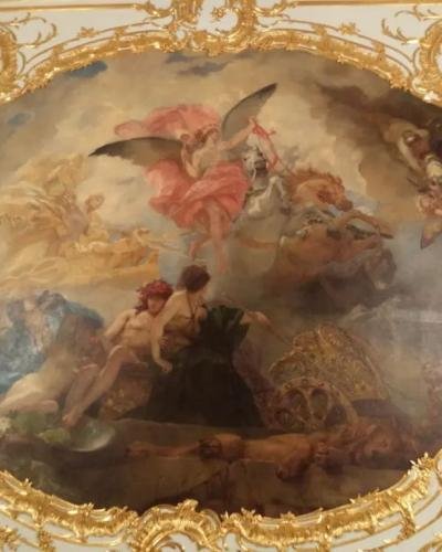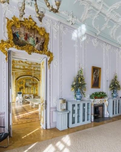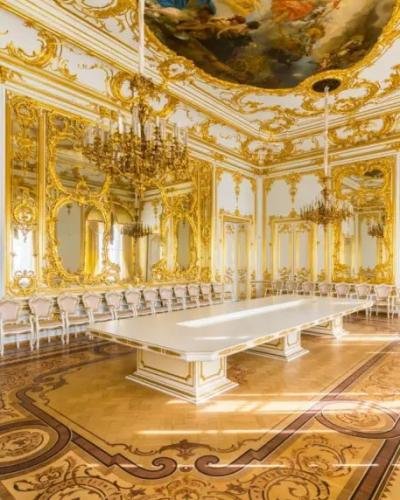 Benois followed the desires of his master, who desired a ballroom decorated with as many mirrors as possible in golden frames, he wished also in the corridors and other rooms, the same gold and mirrors scheme, though Benois respected most of the elegant and delicate work of G. Bosse, while rearranging and ordering painted ceilings in several halls and plafonds. The interiors revolved around a central imperial staircase leading to a grand hall, to the right of which we find the Ballroom and Dinning Hall (overlooking the parade courtyard from the left wing), and beyond the Ballroom, the Winter Garden, which, the owner complained about the ‘tall’ palm trees that forced him to raise the ceiling twice in those years costing him 20.000 rubles ( a huge amount in the 1890s). By1886, everything was ready and the newly decorated palace was filled with treasures, antiques, paintings and priceless pieces of art and furniture.
