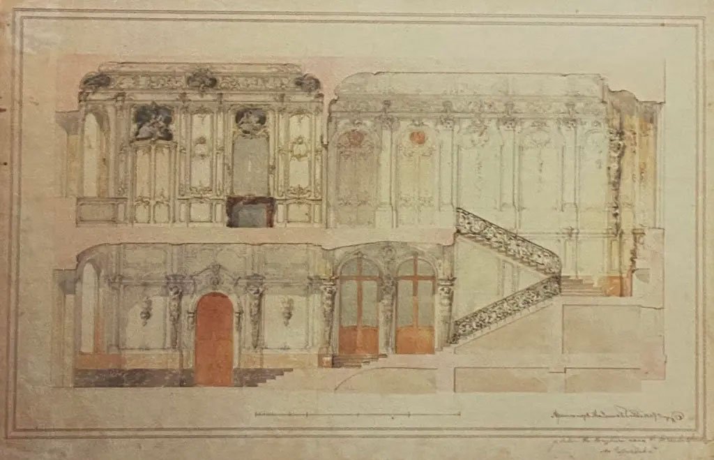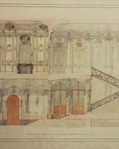 It was at the start of the 1880s that Nechaev-Maltsev became the proprietor, just when he had been nominated ‘Conseiller d’Etat Imperial’. Enthused with his new rank, he endeavoured to create a palace fit to receive the Imperial Family. He was very much involved in the restoration and revival of its interiors. The architect Rezanov recommended was Leonty Benois for the big task ahead. Netchaev-Maltsev studied every single detail, including ventilation and noted once “During the dance [the temperature] did not drop below 15 and did not exceed 16 after the mazurka”. An apartment for his great nephew had been also disposed on the right wing overlooking the parade courtyard and united to Nechaev-Maltsev by a common library.