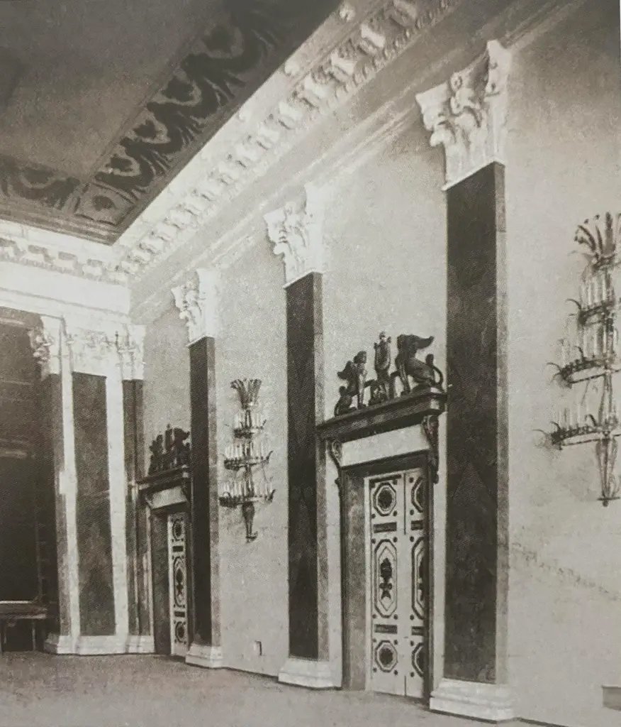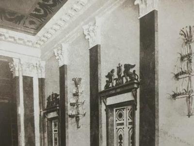 The building of the house overlooking the embankment of the Moika River was built from 1907 to 1909 according to the project of the architect E. S. Vorotilov. Its facade replicates the appearance of the Armenian Church House (Nevsky Prospekt, 40) as well as the interior of several of its rooms, where the Abamelek-Lazarev couple had first lived. In 1911 Abamelek-Lazarev bought the house number 24 on Millionnaya street. Part of the house facing the Moika was broken, and here the architect, I. A. Fomin, built a new one from 1913 to 1915. The façade of the Moyka is spectacularly decorated with bas-reliefs and Corinthian pilasters, rising to the height of the three floors of the house. The parapet is decorated with vases. In interior decoration, Fomin used natural and artificial marble together with decorative sculptures and paintings. It is worth noting that the corridors and their high ceilings are twice the height of the ceilings of the ‘old’ dining room and home theater.